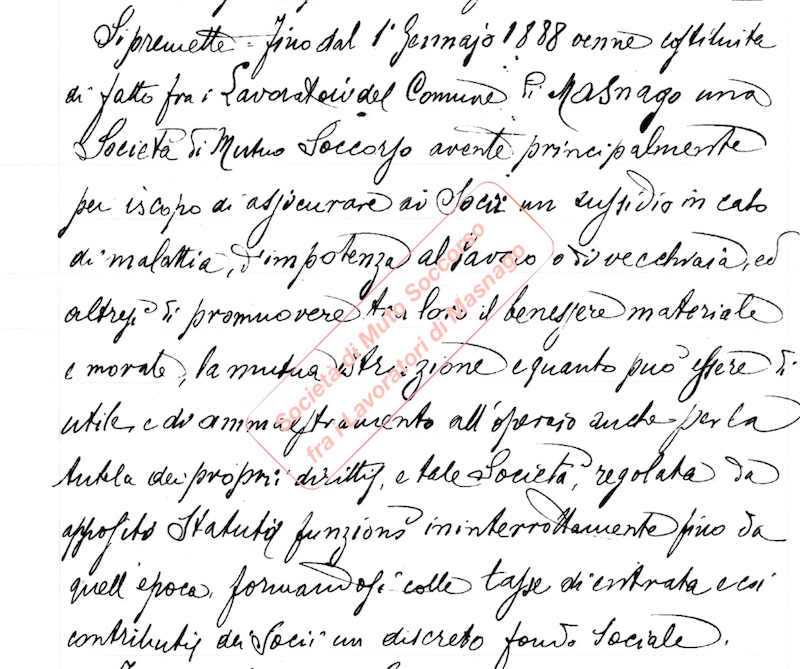 >>>omissis<<< Si premette fino dal 1° Gennaio 1888 venne costituita di fatto fra i Lavoratori del Comune di Masnago una Società di Mutuo Soccorso avente principalmente per iscopo di dispensare ai Soci un sussidio in caso di malattia, impotenza al lavoro o di vecchiaia, ed altresì di promuovere tra loro il benessere materiale e morale, la mutua istruzione e quanto può essere di utile e di ammaestramento all’operaio anche per la tutela dei propri diritti, e tale Società , regolata da apposito Statuto, funziona ininterrottamente fino da quell’epoca formandosi colle tasse di entrata e coi contributi dei Soci un discreto fondo Sociale. >>>omissis<<<